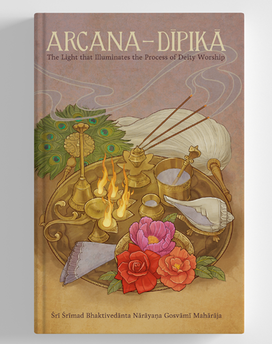 Arcana-dīpikā means “the lamp that illuminates arcana”. The term arcana signifies honour, or worship. As one of the nine processes of devotional service it refers to worshipping the deity form of the Lord. Arcana-dīpikā teaches us how to perform this service and thus please the Lord through this process of worship. It contains the exact details of worship, waking, bathing and feeding the Lord, and putting Him to rest at night. It also includes exact details of the rules and regulations for brahminical cleanliness – all to help us develop pure bhakti.