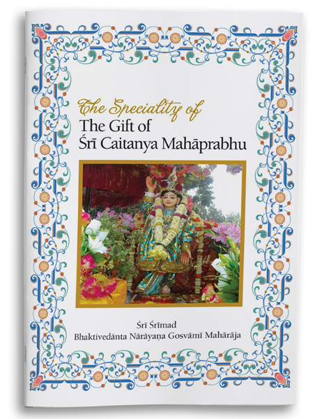 This short treatise describes Śrīman Mahāprabhu’s extraordinary compassion upon the souls of Kali-yuga. It focuses on His identity, the three purposes of His advent, a unique description of the eight unprecedented distinctions of His compassion, and His most sacred gift to the souls of this age. Śrīman Mahāprabhu gave full freedom to His unprecedented mercy potency, telling her, “Karuṇā, I surrender unto you. In whichever direction you choose, however far you want to go and to whatever place you want to travel, drown everyone in the flood of prema.”